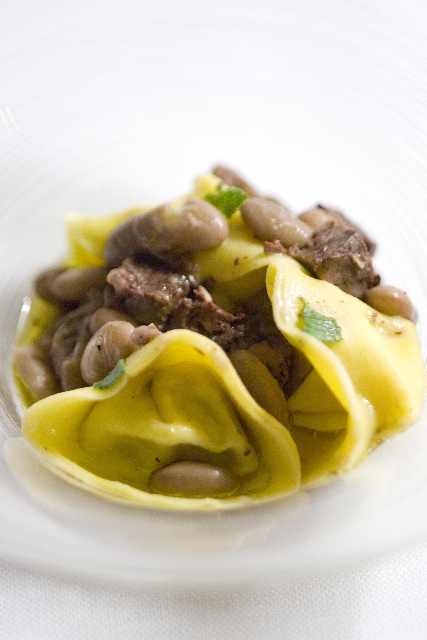 CAPPELLETTO CON CUORE DI POLENTA, CIPOLLOTTO, FAGIOLO SCRITTO, MALLEGATO. Ritorno all’antico, ai sapori della nonna. Non c’è unanimità: i miei soci lo trovano perfino di mano leggera, io eccessivo. Comunque ha un suo perché, anche storico.