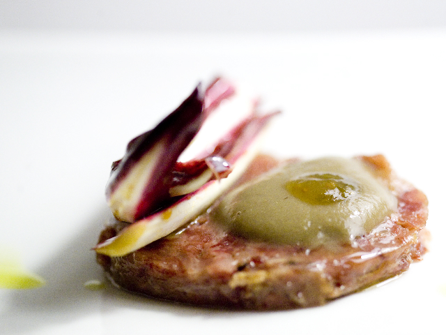 Golosa e di buona fattura e materia la SFOGLIA DI COTECHINO MODENESE TRA LENTICCHIE, MOSTARDA DI DI FICHI E INSALATINA DI RADICCHIO.