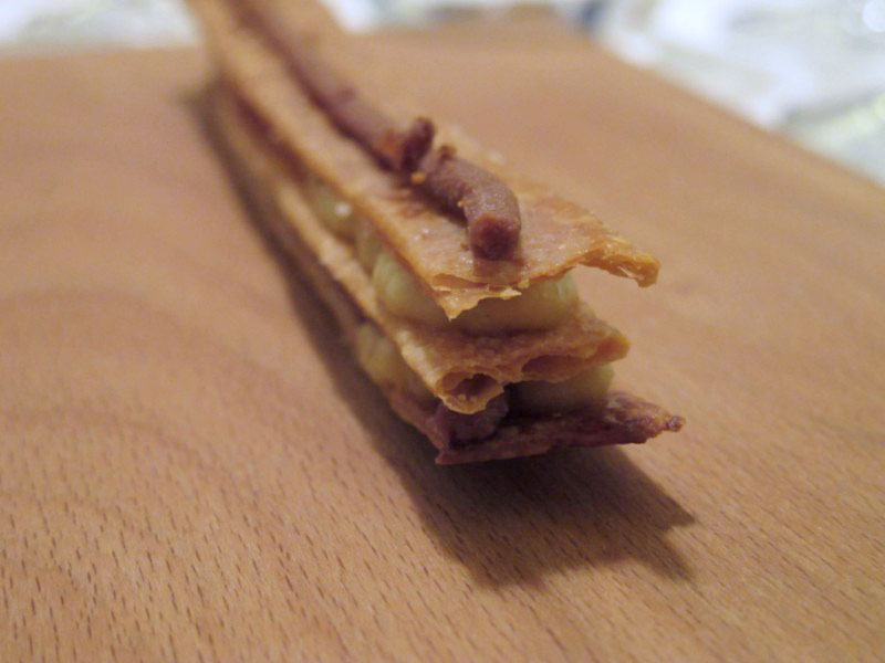 Scorrono via con piacere i vari dessert, fra giochi di spugne, (anche qui ragazzi non – se- ne- può -più, due su due pasti nella stessa giornata) tiramisù corposi ma non bolsi e un bel CROCCANTE DI SFOGLIA, CREMA DI NOCCIOLE E CIOCCOLATO AL CARAMELLO, FALSO PEPE DEL PERU’.