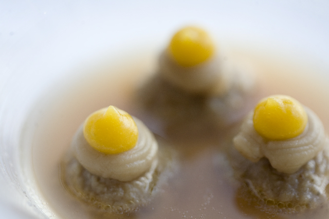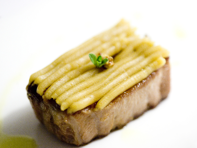 Poteva essere interessante anche lo GNUDO DI RICOTTA, ROSMARINO, ARANCE, PINOLI, IN CAMICIA DI CASTAGNE, altro piatto che va a cercare ricordi di bimbi. Ci racconta il buon Donati di una preparazione talmente lunga che appare sfiancante e nella quale si perde anche la filologia del concetto, con il risultato che il piatto alla fine perde un po’ il nerbo, la finezza ma soprattutto l’essenza del sapore. Rivedibile.