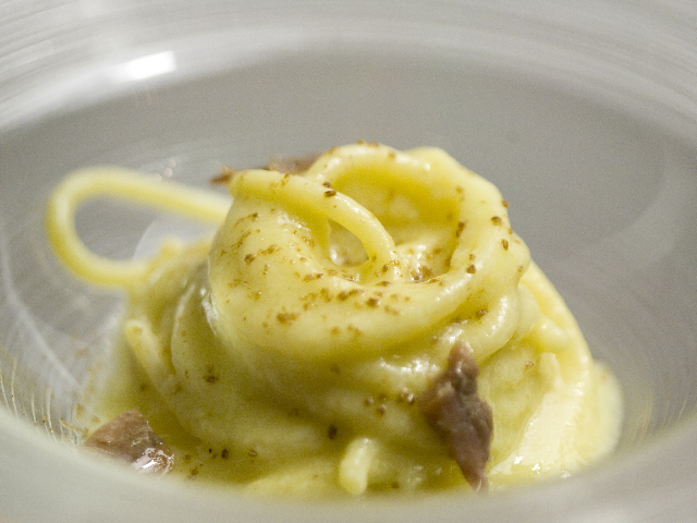 Applausi per il piatto della serata: SPAGHETTONE BENEDETTO CAVALIERI, CREMA DI PORRO, CUMINO E ACCIUGHE, con il quale lo chef dispone con arte del cumino,pericolosissimo nelle sue sensazioni forti, qui al servizio di un piatto eccellente, ruffiano si, ma bello anche nella concezione. È qui che abbiamo trovato la luce. E’ da piatti come questi che Donati deve trarre spunti per definire finezza, intensità di sapori e colpi d’arte. Bravo’.