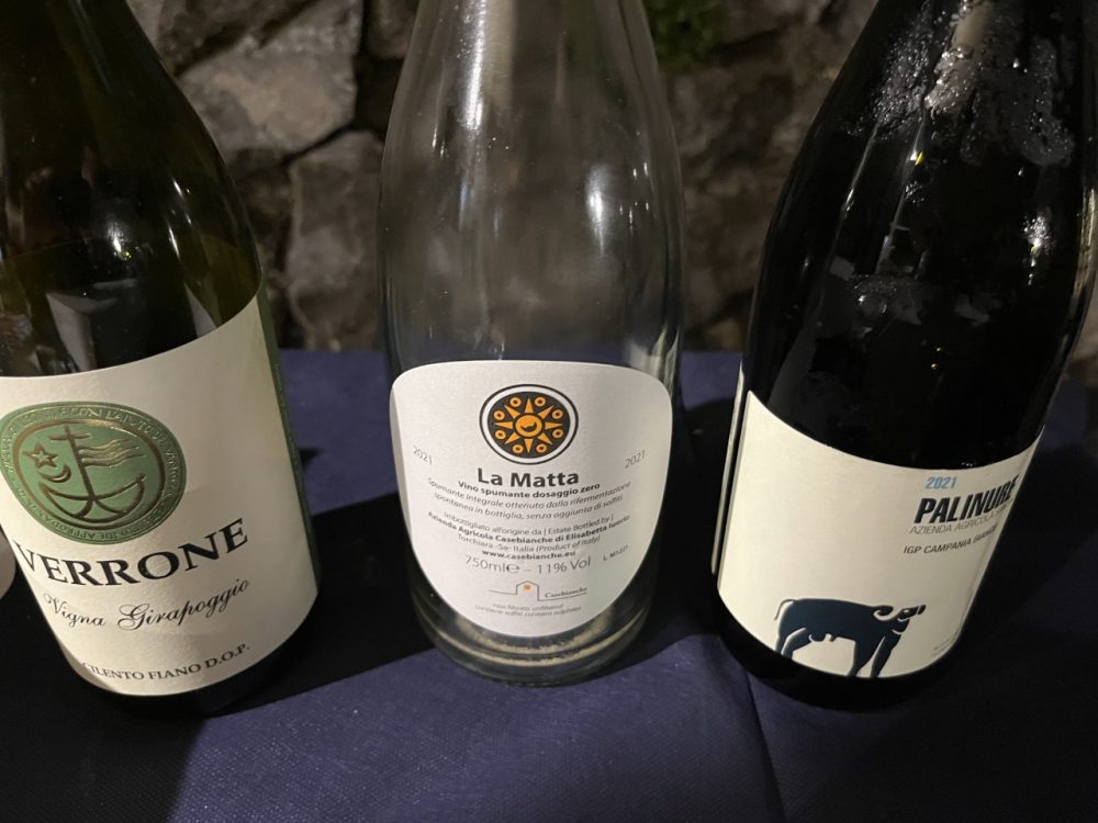 Non poteva mancare un calice da accompagnare ai piatti ed ecco che tre aziende cilentane, Casebianche, Verrone e San Salvatore 1988, hanno voluto omaggiare i presenti con le loro produzioni, in un riuscitissimo matrimonio Cilento-Monti Lattari.