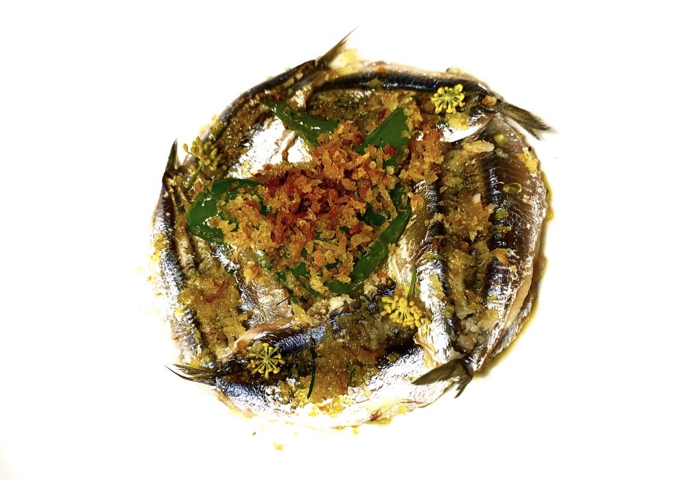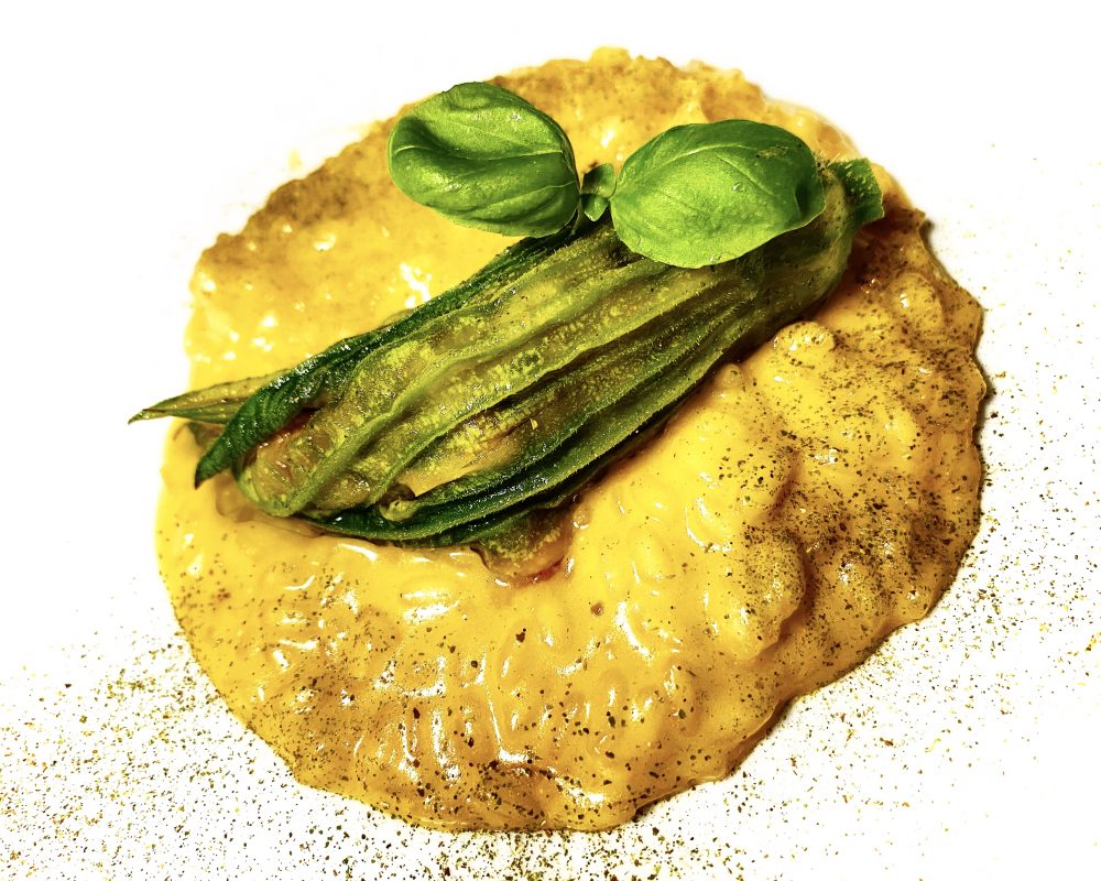 Del primo filone fanno parte una serie infinita di riferimenti in forma di ingredienti e materie prime che seppur minimi nelle quantità, contribuiscono ad esaltare il sapore di ogni singolo piatto, amplificandone la portata e la percezione sensoriale. Dalle lamelle di aglio micronizzate che accompagnano quasi sempre i pomodori, alla tempesta di fiori di finocchietto che accompagna il mare mazzoniano versione 2020, alla brunoise di verdure che si cela nel fiore di zucca ripieno che corona il nuovo “Risotto d’estate” di Stefano Mazzone, alle verdure in cianfotta di cui è ripiena la pasta lievitata al forno in apertura, agli ingredienti di quel mare ricco di molluschi, crostacei e pesce che fanno da letto alle tofette con la zuppa di pesce, all’indivia brasata che accompagna il filetto di spigola con le sue cozze. Insomma un vero susseguirsi di dettagli piccolissimi eppure di gran carattere che diventano tanti piccoli riferimenti allegorici danteschi da cercare in una sorta di caccia al tesoro intellettuale da condursi a tavola.