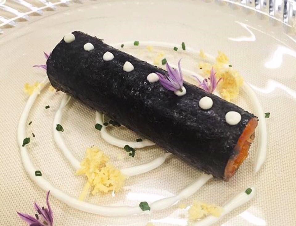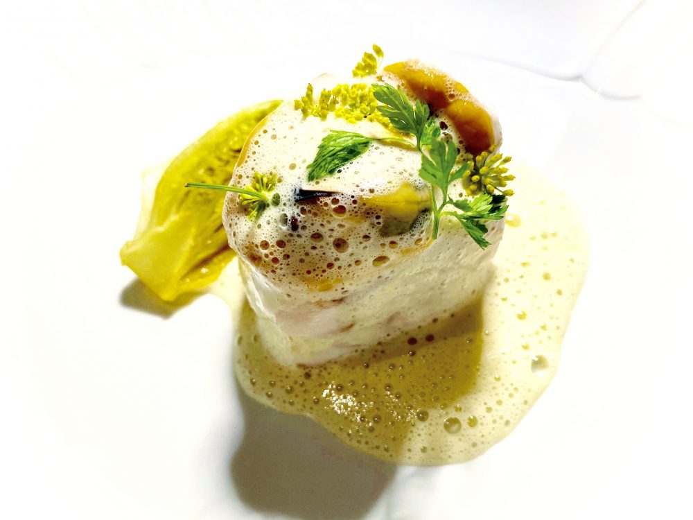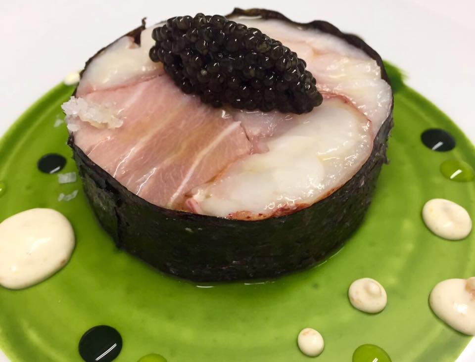 La mia degustazione comincia dal Giappone e dalla profonda ammirazione che Stefano Mazzone nutre per questo paese, che già ha visitato in passato e per la sua tradizione culinaria, in primis quella del sushi. Si comincia infatti con il “Mare Nostrum in terrina”. Contaminazione tecnica ed estetica tra un tradizionale sushi roll e la charcuterie francese. Terrina composta da crudo di astice blu, scorfano, ventresca di tonno avvolto ovviamente dall’alga Nori, il tutto su maionese al plancton e salsa olandese ai ricci di mare. Il tutto coronato da una generosa dose di caviale Italiano Calvisius. Piatto di grandissima resa scenica, conquista tanto alla vista quanto al palato in virtù della fresca dolcezza delle materie prime, esaltate ancor di più dalla sapidità del caviale.