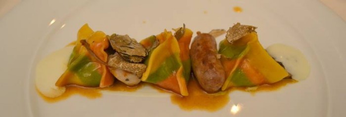 Raviolo di coniglio di fossa, confit fondente di pecorino, spuma di patate all’acciuga, tartufo nero di di Michele Deleo del Rossellini’s del Palazzo Avino di Ravello
