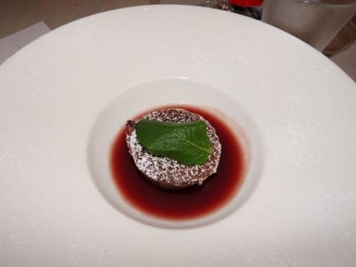 Il servizio e l’apparecchiatura sono di alto livello. La cene si è sviluppata su quattro piatti: una cipolla bionda cotta al sale con una coscetta di quaglia e crema di patate Ratte, dei tortelli di ricotta con punte di asparagi e burro alle nocciole, un cubo di sottofiletto croccante con semolino dolce fritto e uno zuccotto di cioccolato fondente e pere.