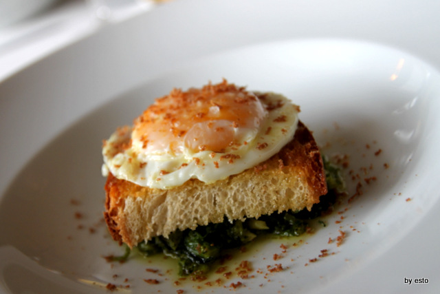 E’ di gallina ruspante, fatto all’occhio di bue, pane verdure e bottarga di tonno.