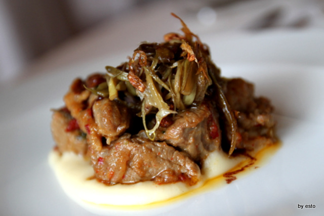 Con lo stracotto di agnello, purè affumicato al legno di faggio e riduzione di Taurasi. Qualche carciofo, è il tempo delle mammarelle, croccante non è solo contrasto tattile.