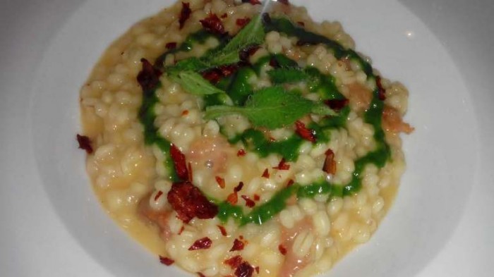 La mano di Luciano Matera si ritrova anche in questo piatto, lui non vuole ostentare nulla e non esaspera gli ingredienti con cotture estremi e sapori forti. L’insieme dolce-morbido dell’orzotto, mette d’accordo il gusto deciso del peperone “crusco” e il Pezzente di Basilicata. Un salame povero che nasceva dalla tradizione della macellazione del maiale e, dopo aver preparato, capocolli, salsicce, pancette e altro di buona qualità, si preparava questo insaccato con i ritagli di lavorazione e il grasso in abbondanza, da destinare alla cottura con sughi ed altro, aromatizzato con finocchio e spezie. Il peperone” crusco” è un’invenzione contadina davvero unica. Dopo la raccolta sono essiccati in ambienti areati e infilati in fili di cotone, per poi essere utilizzati fritti, tanto da diventare croccanti e poterli grattugiare, o metterli in vari sughi di carne e di pesce come il baccalà.