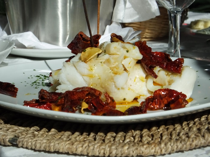 Arrivano i secondi. Un soffio chiaro e marcato dei sapori della tradizione. Galletto al vino bianco, Capretto alla brace e Baccalà alla treniera. Quest’ultimo un altro piatto che attraversa il confine. Del baccalà servito con uno sfritto di olio, aglio (che si mangia) e peperoni cruschi. I cruschi sono cotti magistralmente ed è cosa assolutamente non facile. Il Don Anselmo intanto in tutta la sua potenza ed eleganza la fa da padrone indiscusso dando un sigillo di garanzia ad ogni portata.