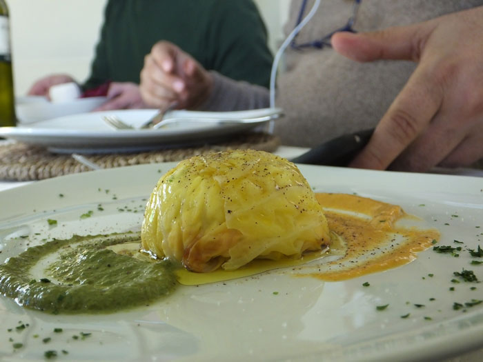 Non finiamo di dividerci gli assaggi che sul tavolo giungono i lampascioni e cruschi, piatto appulo lucano per eccellenza. Da qui la tradizione incontra degli alleggerimenti. Sformatino di verza con cuore di ricotta al basilico e salsa di basilico e peperone dove i sapori netti e marcati della verza sono coniugati alla delicatezza del cuore caldo di ricotta e dalla freschezza del basilico e l’involtino della nonna, un piatto tipico della tradizione melfese rivisitato, dove alla pasta di pane è sostituita la pasta fillo che racchiude patate, funghi cardoncelli e salsiccia al finocchietto.