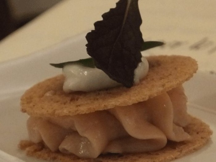 Un felice incontro tra un must della cucina campana quale la seppia con le patate e il piatto della nonna “patate e carciofi” ingentilito da un sapiente gioco di consistenze che si sviluppava in crescendo dalla patata attraverso la seppia per poi finire al carciofo croccante.