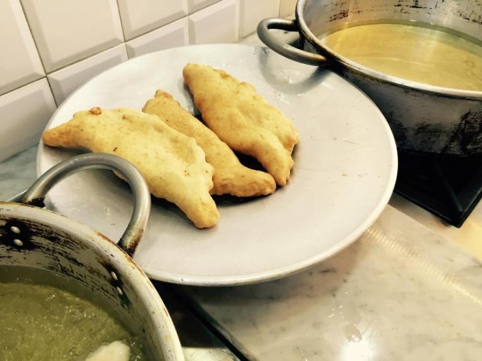 La seconda è l’impasto. Le pizze fritte (a calzoni, o ripieni) delle vetrinette sono alquanto panosi mentre lo strato della pizza di questi maestri dlel’impasto è sottolissimo, proprio come quello della pizza al forno. Il risultato è che al palato non si distingue più la farina dagli altri ingredienti, si realizza una fusione perfetta, ancora più intensa di quella ottenuta dalla cottura al forno dove invece resta il sentore di farina (quello che gli analfabeti gastronomici definiscono “poco cotta”).