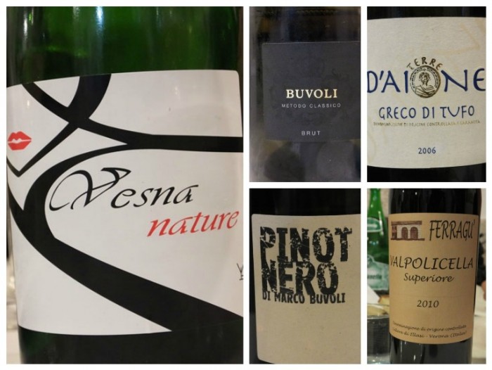Le Antiche Sere, i vini: Vesna Nature, Buvoli metodo Classico Brut, Greco di Tufo 2006 Terre d’Aione, Pinot nero di Marco Bugoli e Ferragù Valpolicella Superiore 2010 di Illasi