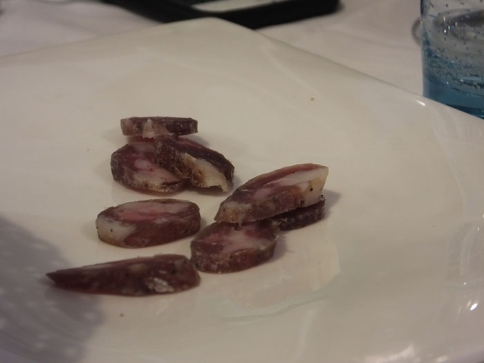 Tra una chiacchiera e l’altra ci accoglie con un aperitivo inusuale. Un fuori carta. La salsiccia del maiale che ha cresciuto. Densa, profumata e con una quota grasso che le conferisce alta solubilità e profondo gusto.
