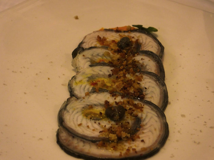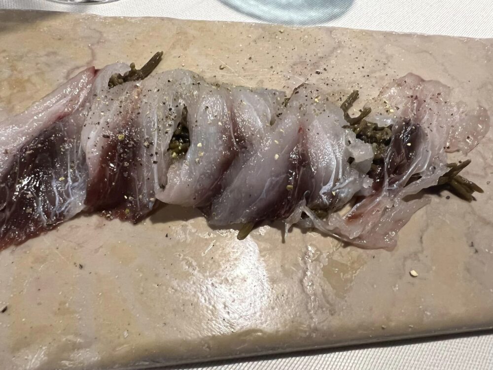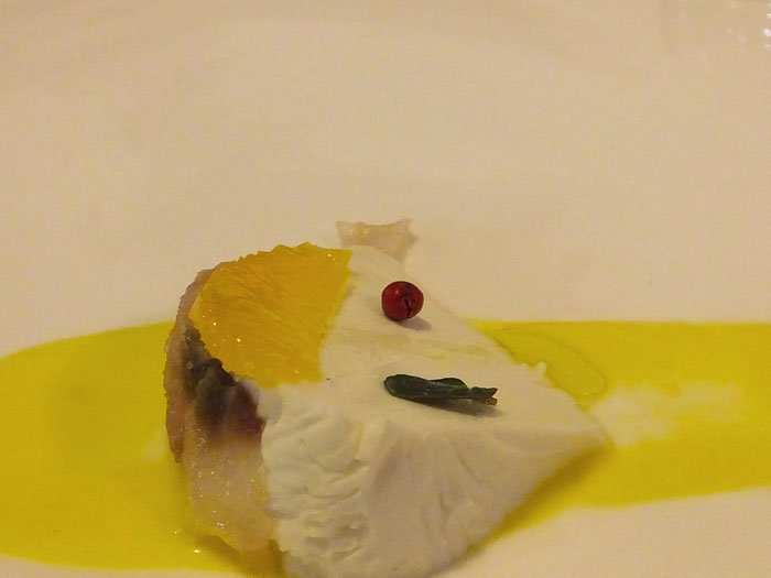 E’ poi la volta dell’anguilla servita in maniera davvero inattesa. Scaloppa di anguilla con zafferano e cappero, pane croccante alla bottarga e pomodoro. Un gioco di sapori e consistenze davvero unico, dove al sapore incisivo dell’anguilla, eviscerata e riavvolta a mò di salame per poi essere cotta e affettata sottilmente fa da contrasto il salino del cappero e la croccantezza profumata del pane alla bottarga e pomodoro. Su tutto la delicata e gentile nota di zafferano che ricorda le origini mediorientali deli luoghi.