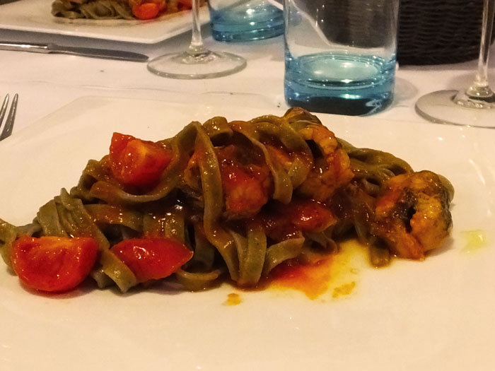 Arrivano dei Tagliolini di grano arso con anguilla. Un piatto ancestrale dei pescatori del luogo. Una pasta povera, composta per almeno un 20% di farina di grani caduti durante la mietitura e poi bruciati sui campi nel loro “rinnovamento” (di qui grano arso), che accompagna un sugo apparentemente povero di pomodori e anguilla. Un sugo che rappresentava, paradossalmente, nella sua povertà, benessere nelle case lesinesi di 50 anni fa.
