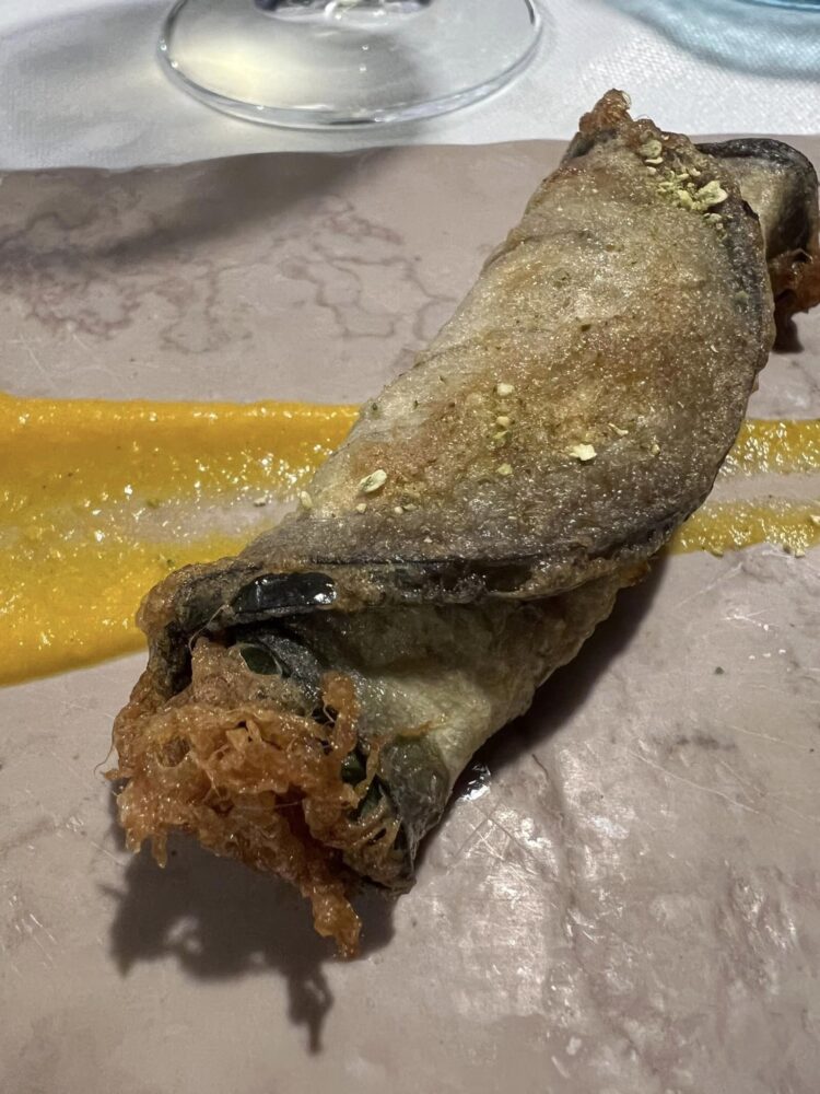 Le Antiche Sere – Involtino di melanzana fritta e cefalo cotto in brodo su crema di zucca