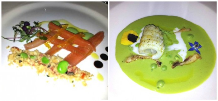 La cena è partita con due antipasti: trota salmonata marinata, tuorlo d’uovo allo stesso modo con maionese al prezzemolo e panzanella primavera di Tommaso e cappuccino ai piselli cotti e crudi con cannelloni di seppia e schiuma di latte di Antonio.