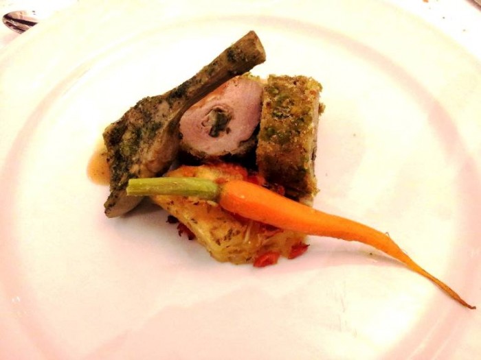 Per secondo Tommaso ha proposto un filetto di maiale cotto a bassa temperatura in crosta ai pistacchi di Bronte farcito con mele, mandorle, guanciale e carciofo di abbinato allo Schioppettino 2010 (100% Schioppettino). Al naso si caratterizza per sentori eleganti che ricordano i frutti di bosco e frutti a bacca nera e note speziate di pepe nero. Vellutato ma allo stesso tempo vigoroso al palato, ha tannini ben strutturati.