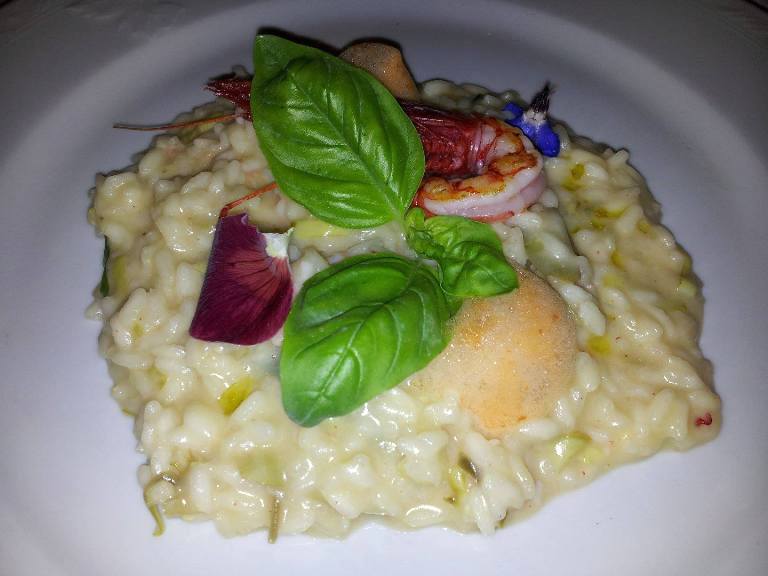 Risotto carnaroli mantecato con gamberi rossi, carciofo bianco di Pertosa, basilico e lime di Antonio Petrone