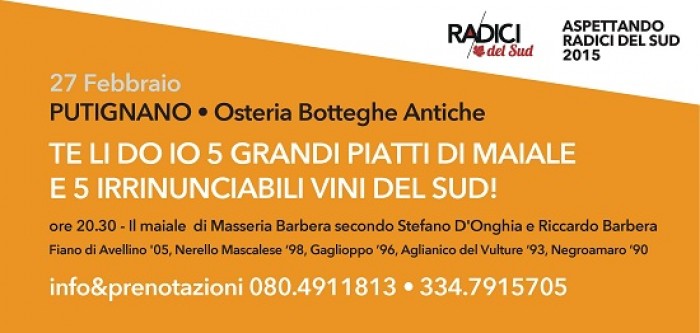 A marzo, giovedì 5 all’Osteria Botteghe Antiche di Putignano sarà la volta del Fiano di Avellino del ‘98, Nerello Mascalese del ‘98, Gaglioppo del ‘96, Aglianico del Vulture del ‘93 e del Negroamaro del’90.