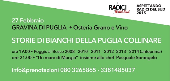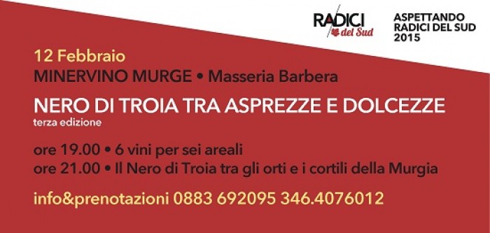 Si parte giovedì 12 febbraio alla Masseria Barbera di Minervino Murge con il “Nero di Troia tra asprezze e dolcezze”, evento giunto alla sua terza edizione, per proseguire venerdì 27 all’Osteria Grano e Vino di Gravina di Puglia con una serata dedicata ai bianchi della Puglia collinare.