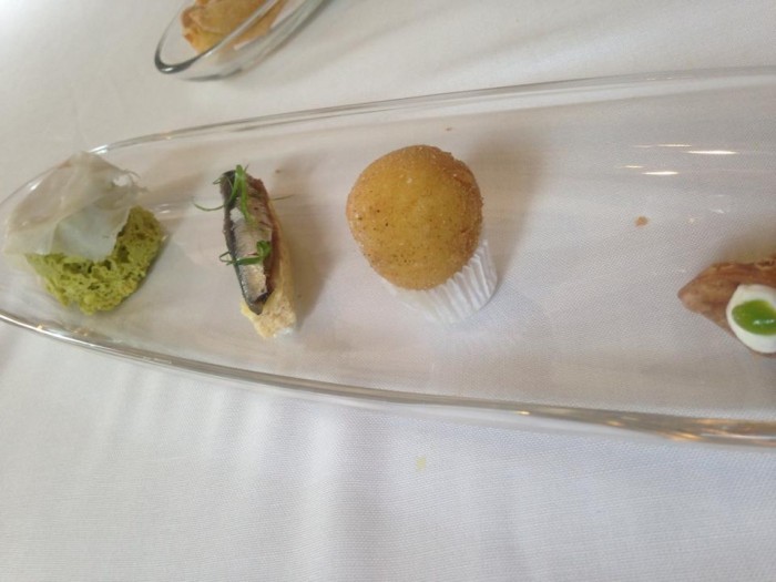 Taverna Estia, sfizi iniziali: lardo e piselli, pane burro e alici, bon bon di baccalà e cannolo di ricotta e fave 5/5/2014 Torna a: Taverna Estia, la straordinaria cucina di Francesco Sposito Taverna Estia, sfizi iniziali: lardo e piselli, pane burro e alici, bon bon di baccalà e cannolo di ricotta e fave← PrecedenteSuccessiva →