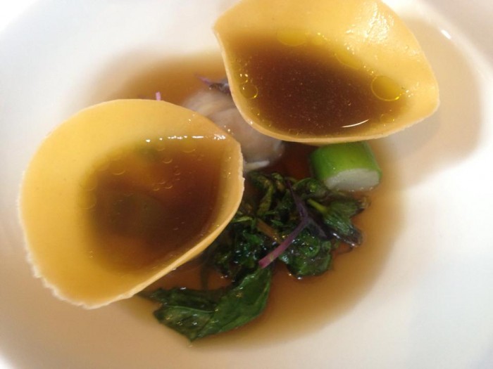Taverna Estia, tortellone di pasta fresca all’uovo ripieno di ricotta leggermente salata, zabaione al Vermouth, primizie, guanciale e tartufo nero