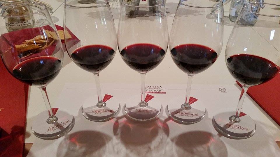 Dopo la panoramica geo-viticola delle vallate e la visita al caveau che coccola la prima bottiglia di Amarone imbottigliata nel 1939, l’assaggio è il momento più atteso. La degustazione dei cinque cru Amarone della linea “Espressioni” Domini Veneti ( lavoro di ricerca durato ben 10 anni il cui nome è un omaggio alla Serenissima che un tempo dominava anche in Valpolicella ) tocca le 5 vallate, dalle quali il nome delle bottiglie. . Identica composizione per tutti i calici di Amarone (Corvina 70% Corvinone 15 % Rondinella 15 %) da vendemmia 2008.