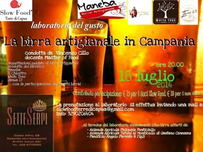 locandina-laboratorio-birra 15/7/2014 Torna a: Capua, 18 luglio. Laboratorio del Gusto di Slow Food Terre di Capua per conoscere il mondo della birra artigianale