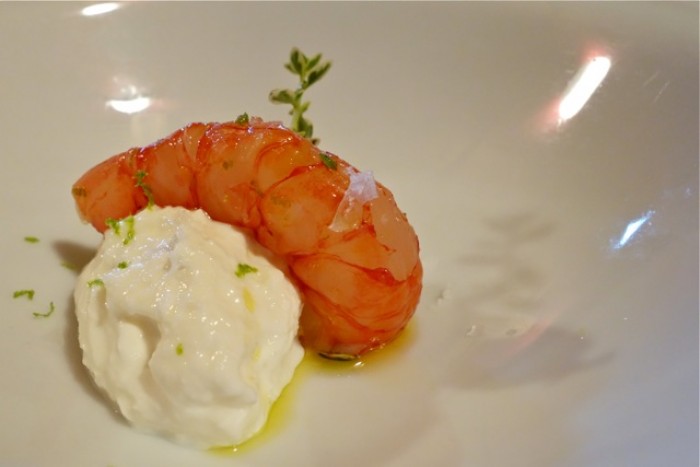 Amouse bouche, ovvero gambero rosso e burrata, con quelle scorzette di lime che danno passione ad un grande classico.