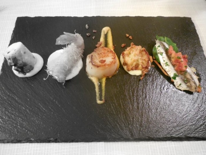 La seconda portata è un bellissimo piatto in pietra lavica con coriandoli di sapore. Cinque degustazioni di pesce elaborato con salse delicate. La presentazione è ottima fra le migliori in Lucca. Ogni assaggio lascia spazio alla fantasia del gusto.