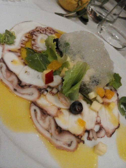 Ancora il polpo lessato, pressato e poi affettato come fosse un salume, secondo una vecchia ricetta in uso lungo le coste campane, condito sempre con quell’olio buonissimo, e arance e mele a piccoli tocchetti per dare una bella spinta in acidità.