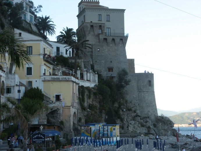 Il tonno e le acciughe sono il tema ricorrente sia nel menù che nei bellissimi racconti fotografici esposti alle pareti. C’è tanta gente e questo particolare ancora una volta mi fa notare quanto siano cambiate le cose perché quando trascorrevo qui le mie estati eravamo in pochi fortunati. Anche se in effetti il paese e gli abitanti hanno saputo preservare gelosamente, e diciamo pure con la loro tipica testa dura, la propria identità, lasciando intatto il fascino della loro amatissima Cetara. La torre angioina che dà il benvenuto all’entrata del paese è stata restaurata ed è proprio un bel vedere. E’ fiancheggiata da una lunga scalinata che conduce ad una bella spiaggia dove andavo in genere a fare il bagno il pomeriggio ed ero così ebbra delle bellezze della costiera che non mi è mai pesato salire e scendere quei gradini, anche più volte in un giorno.