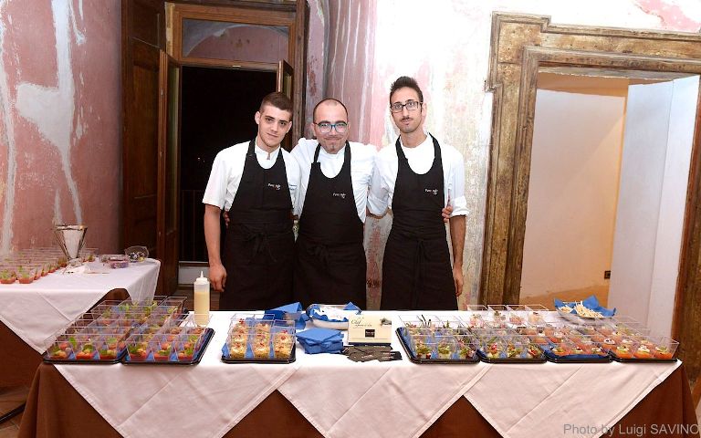 Nando Melileo ha presentato salmone marinato ai sali con noce di burro brioche; sfogliatella aperta su fior di ricotta e gambero crudo; cappuccino di mare con nero di seppia, cremoso di patate e caviale; tortino di alici con carbone vegetale, alice cruda, pomodoro San Marzano e ghiaccia di mozzarella.