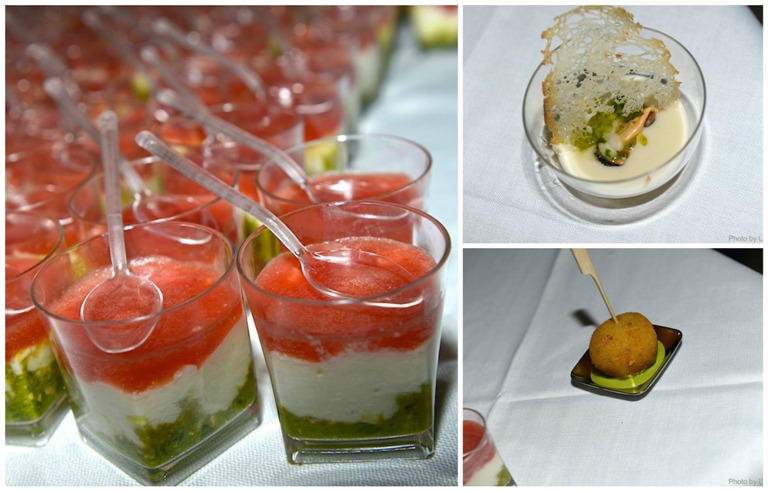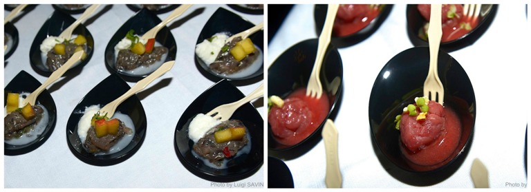 Queste invece le creazioni di Giuseppe Misuriello: insalata liquida (cicoriella) con ortaggi crudi (peperone, pomodoro, piselli), cipolla marinata nel mandarino, fico disidratato, mandorla croccante, terra di funghi porcini e formaggio di capra; gambero rosso marinato agi agrumi con purea di mandorla bianca, lampone disidratato e dragoncello; tartara di alici, buccia di limone, menta, pesca e mozzarella di bufala liquida; polpetta di girello di podolica crudo, centrifugato di pomodoro, olio alla lavanda e mango croccante.