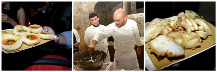 Al pian terreno Tommaso Morone con l’angolo dei fritti, il ‘cuoppo’ di baccalà e calamari fritti e le montanare, proposti in abbinamento agli spumanti.