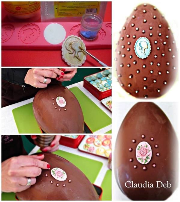Per la decorazione, realizza dei cammei: prendi della pasta di zucchero (io ho usato la gum paste), stendila in un stampino di silicone. Rimuovi e dipingi con coloranti alimentare in polvere diluiti con qualche goccia di alcool. Fai asciugare. Applica il cammeo al centro dell’uovo, incollandolo con della glassa reale.