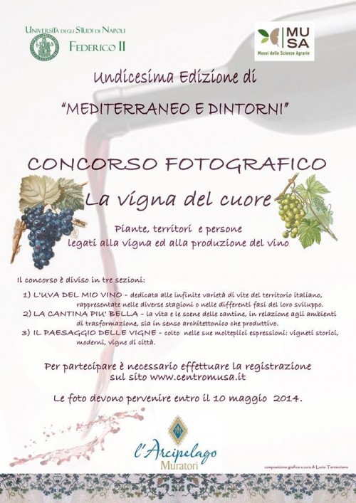 Il MUSA, Centro Museale Musei delle Scienze Agrarie – Università degli Studi di Napoli Federico II, indice il Concorso Fotografico “LA VIGNA DEL CUORE” per valorizzare le irripetibili peculiarità del patrimonio colturale e culturale delle vigne e del vino anche con il mezzo fotografico e proprio attraverso gli occhi di coloro che abbiano un legame particolare con un luogo o un paesaggio di vigneti e di viti e che vogliano condividerlo con altri.