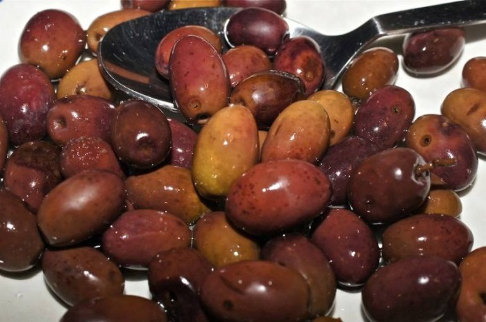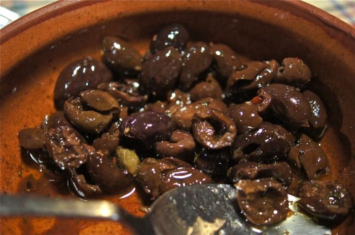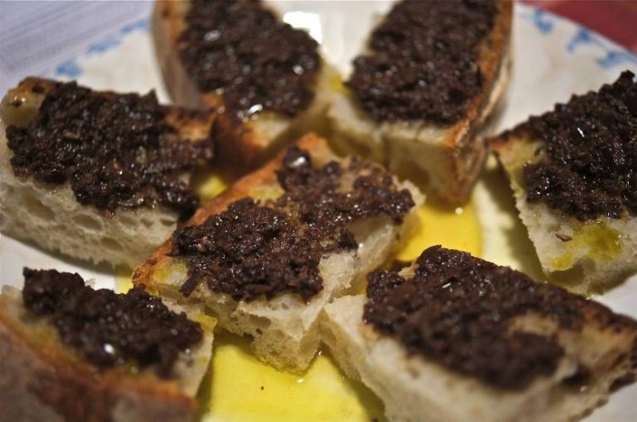 Antipasto Sangiovanni: oliva caiazzana al naturale e condita, bruschetta con paté di olive.