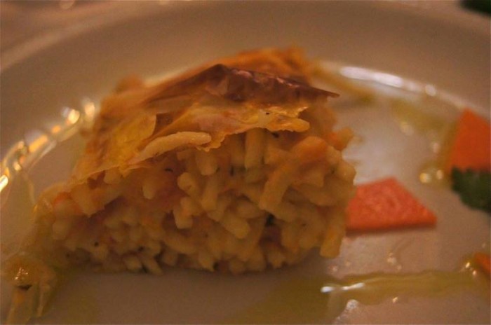 Un primo piatto: scialatielli in pasta fillo con zucca, salvia e parmigiano.