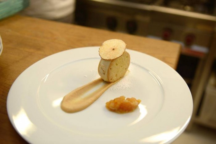 Carciofo dolce con mousse di nocciola tonda di Giffoni su salsa inglese alla liquirizia e cialda croccante di tre zuccheri