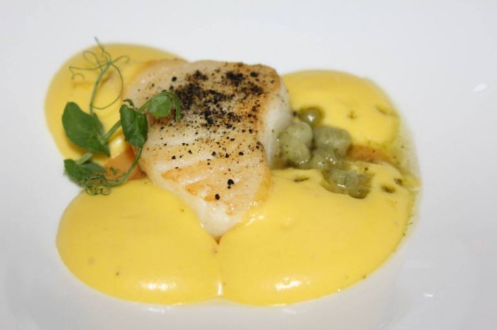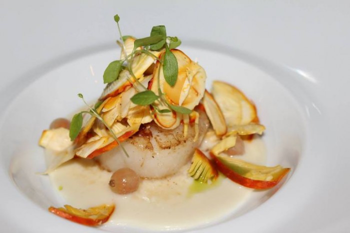 Da Vittorio, medaglioni di capesante con crema all’aglio insalatina di ovoli e ribes bianco all’olio di sesamo