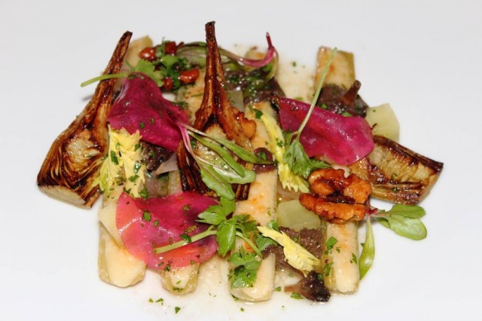 Un piatto vegetariano in cui mineralità, sapidità ed acidità sostengono ogni assaggio. L’aroma vegetale è declinato in tutte le sue sfaccettature. La base del piatto è formata dai gambi di sedano ripieni di Parmigiano e gratinati, a leggerlo si immagina qualcosa di morbido e pastoso, in bocca restituisce invece freschezza e salivazione. Intelligente.