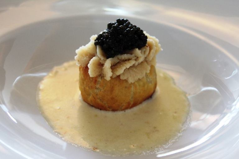 Dispensa Pani e Vini, gamberi in bianco e nero tartare di gamberi con spuma di agrumi panna acida e caviale