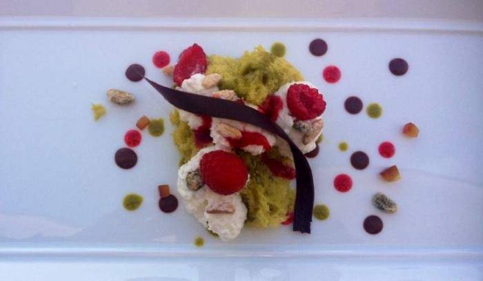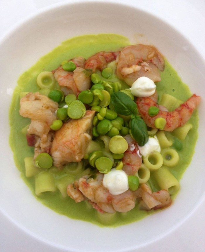 Il percorso, aperto con crudo di gamberi e maionese al rafano, è proseguito con una pasta in crema di piselli, arricchita da formaggio di capra e “macedonia di crostacei”.