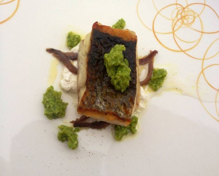 Perfetta l’ombrina con burrata, acciughe, e fave; sapori rotondi e intensi, ben adatti allo sposalizio col Vintage 2005.