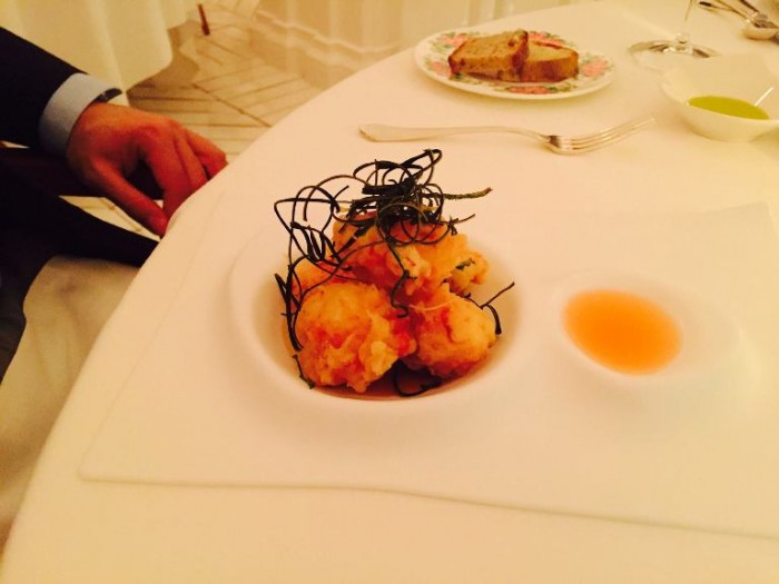 Sempre in carta un classico dei classici, la zeppola d’astice rivisitata nel 2010 ma che io ho provato per la prima volta nel 1998 quando in questa sala si presentò il Campanaro dei Feudi di San Gregorio.