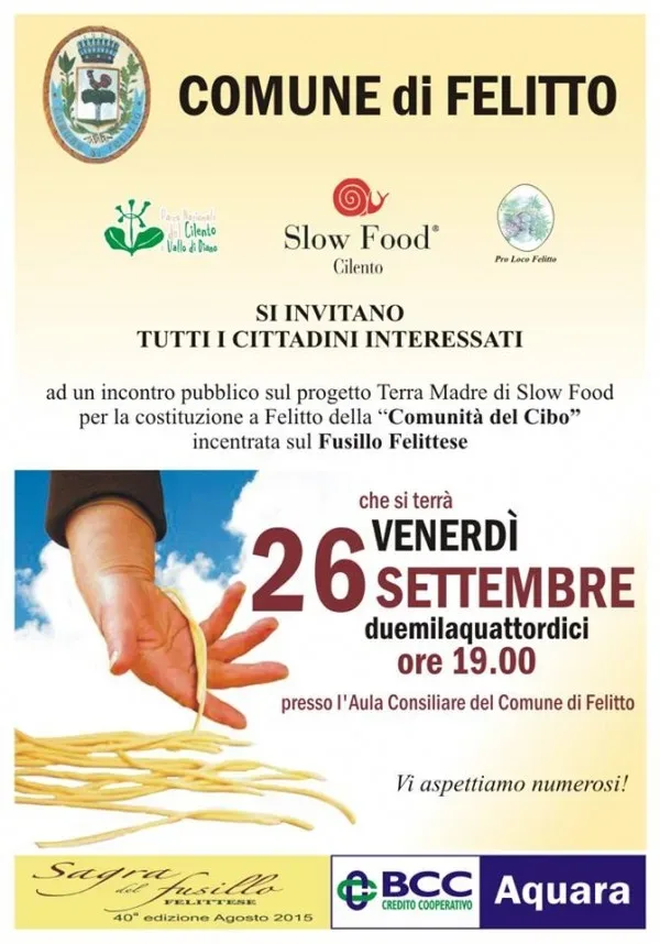 slow-food-a-felitto 24/9/2014 Torna a: Felitto, 26 settembre. Incontro per una Comunità del Cibo sul Fusillo Felittese